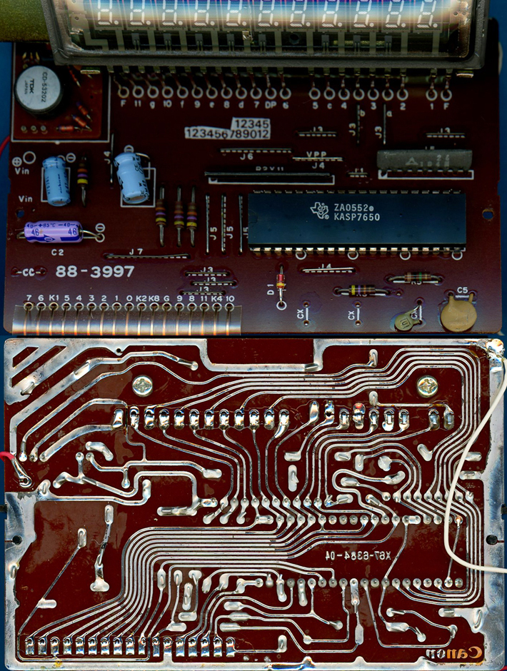 The printed circuit board (PCB) of a Canon Canola L1010 calculator manufactured in January 1977 with its (mirrored) backside.