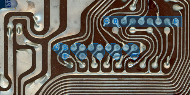 (PCB) of a Canon LE-85 prepared for both hybrid circuits