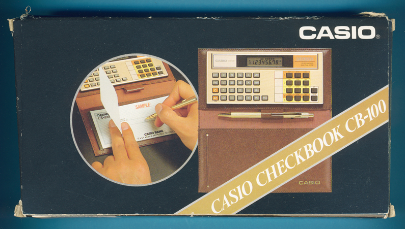 box of the Casio CB-100 Checkbook calculator sold around 1985