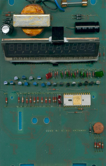 (PCB) of the Corvus 300E desktop calculator sports some mystery holes and slits. The Corvus 305 reveals the secrets of them. |