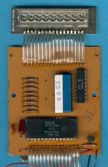 the MOSTEK MK5020A calculator circuit and a LED-stick manufactured by Hewlett-Packard. |