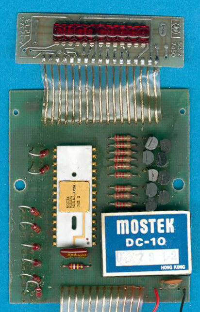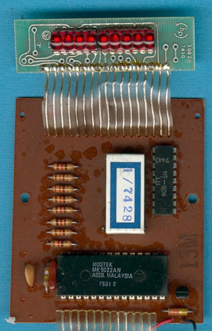 early MOSTEK MK5022A calculator circuit and a LED-module manufactured by Hewlett-Packard. |