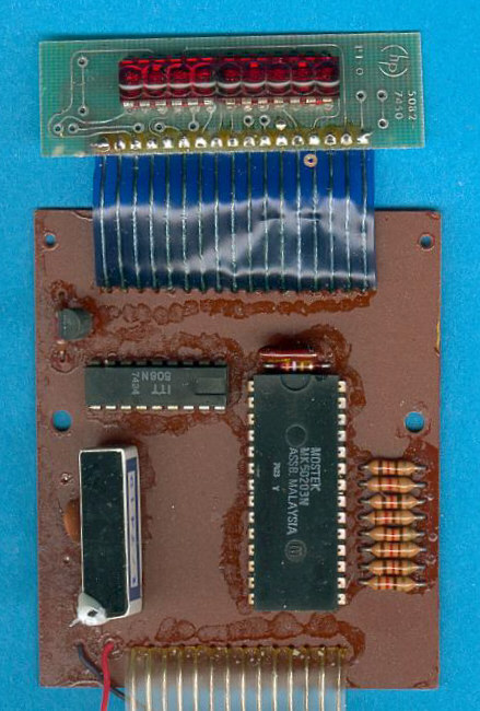 the MOSTEK MK50203 calculator circuit and a LED-module manufactured by Hewlett-Packard. |