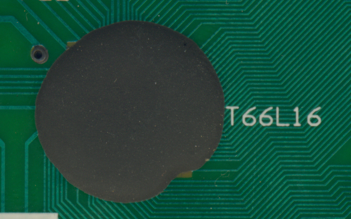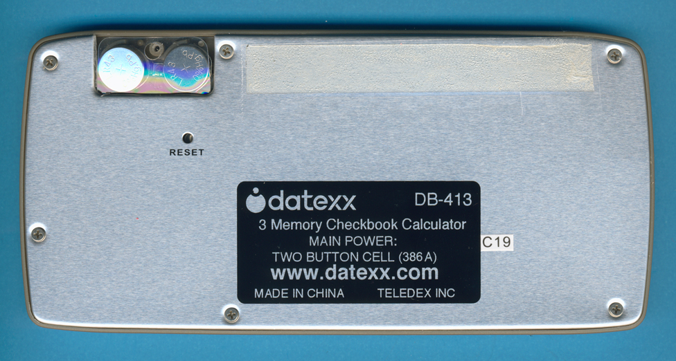 (PCB) of the Datexx DB-413 calculator is centered around a T66L16 single-chip calculator circuit hiding under a small epoxy blob.