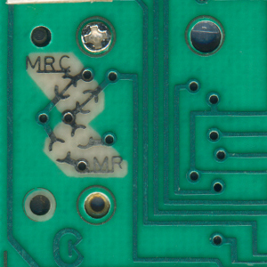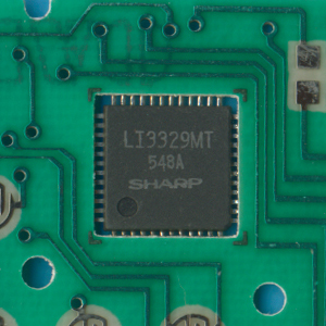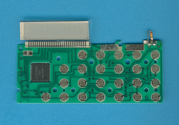 (PCB) of the Enterprex MC-2717 Checkbook Calculator is centered around a Sharp LI3329MT single-chip calculator circuit.