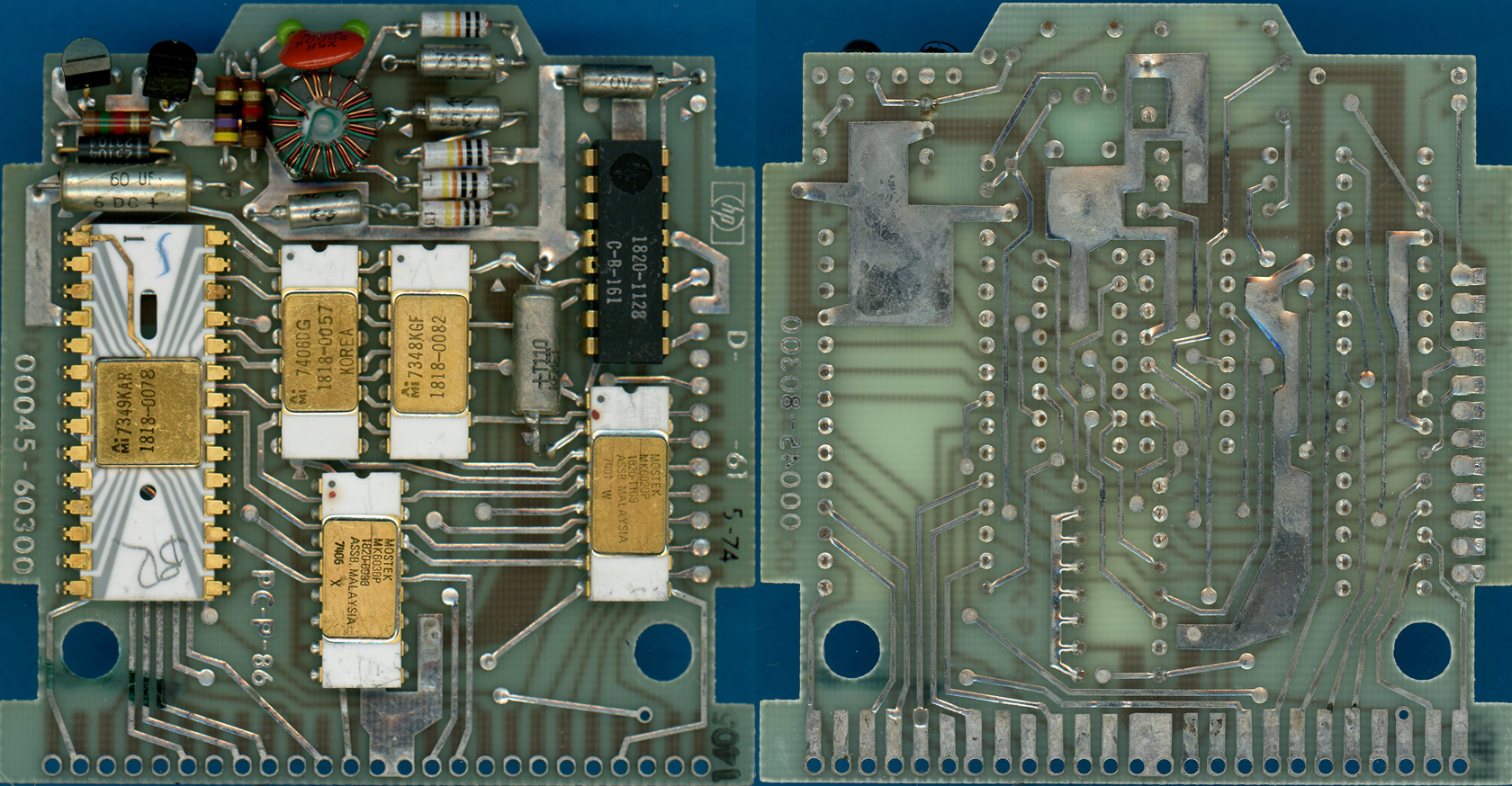 The printed circuit board (PCB) of a HP-45 calculator with its (mirrored) backside.