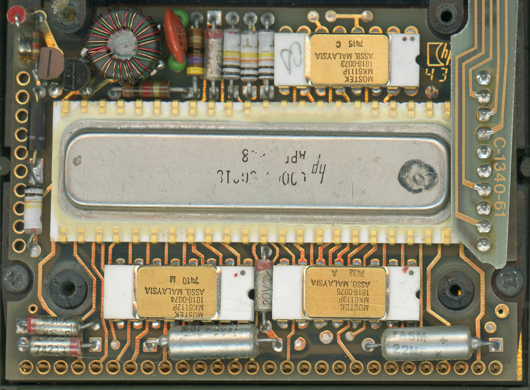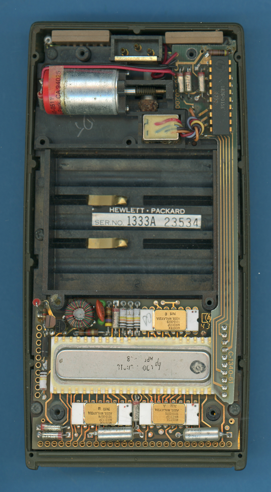 around a HP-proprietary CPU module and supported by 3 ROM chips manufactured by Mostek, electronics for the integrated card reader and power supply.