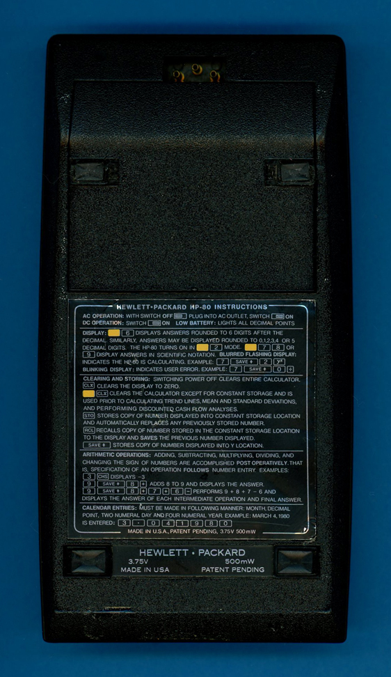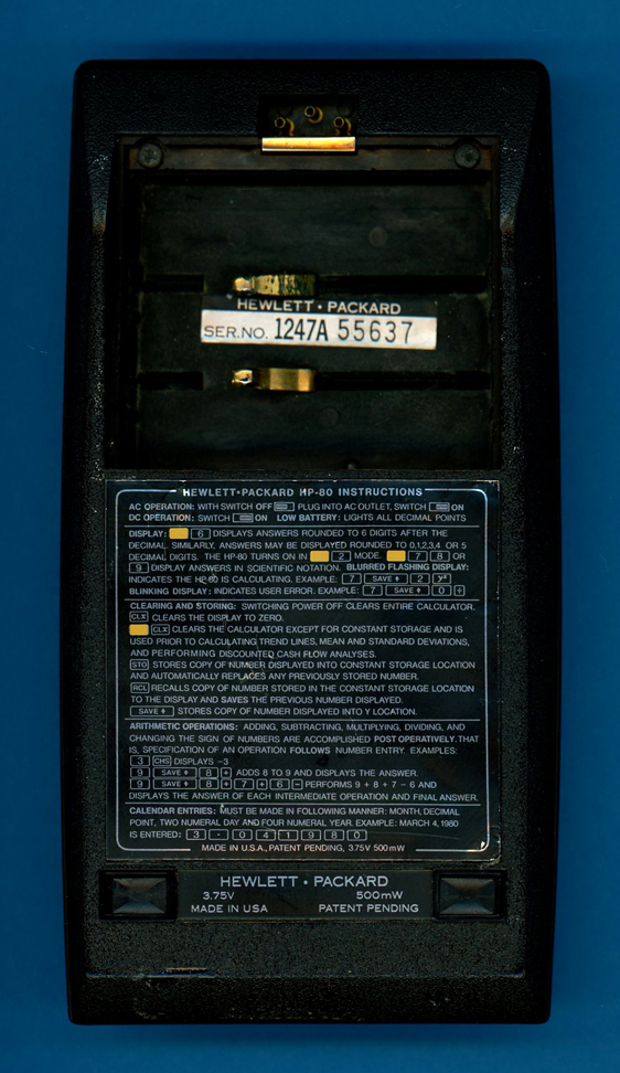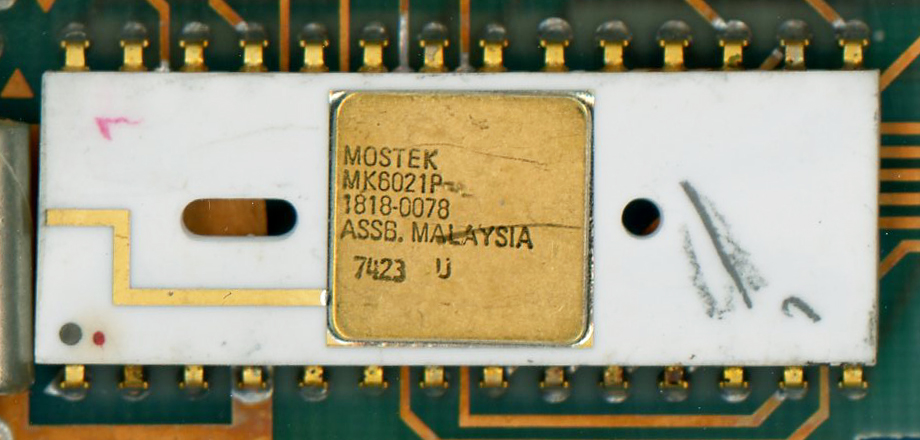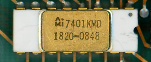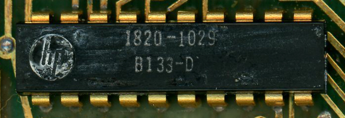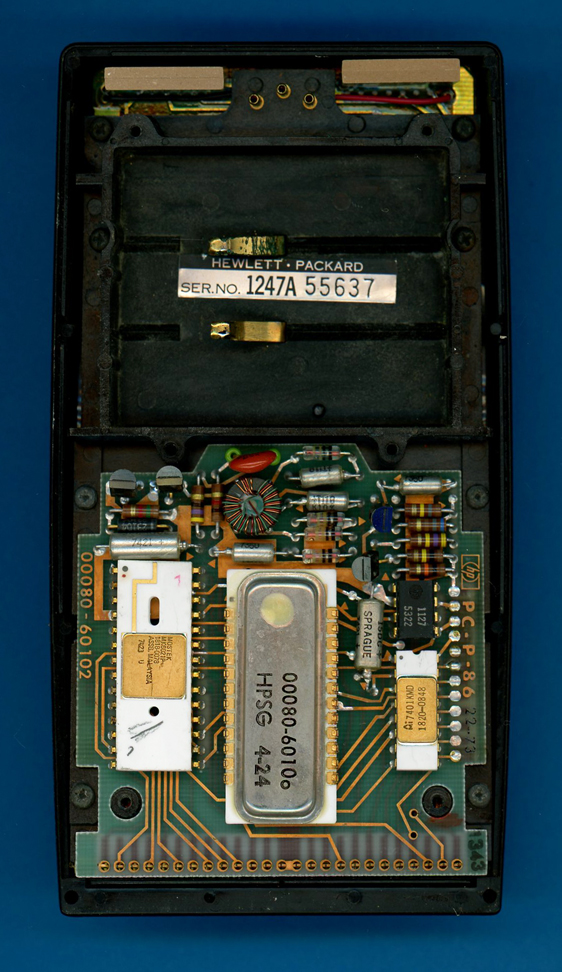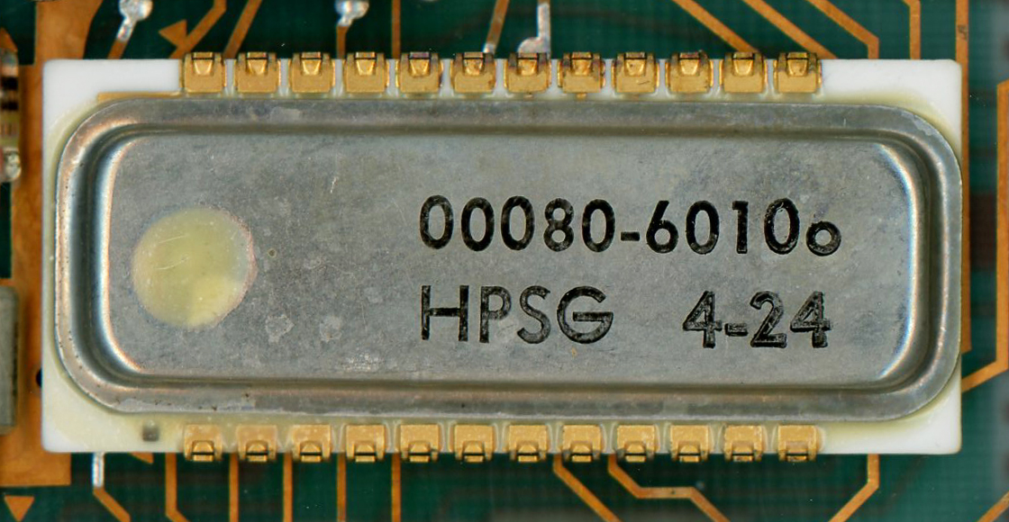 around the HP 1818-0078 Control and Timing Chip and the HP 1820-0848 Arithmetic and Register Chip in white ceramic packages and seven ROM Chips with a capacity of 256*10 bits, each mounted in a ceramic hybrid package and supported by a HP Clock Driver and power supply.