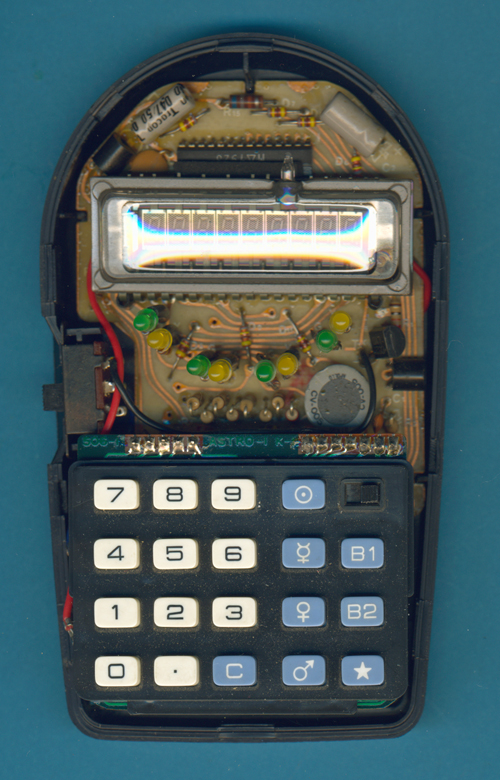 (PCB) of the Kosmos Astro astrological computer is centered around a TMS1470 single-chip microcomputer.