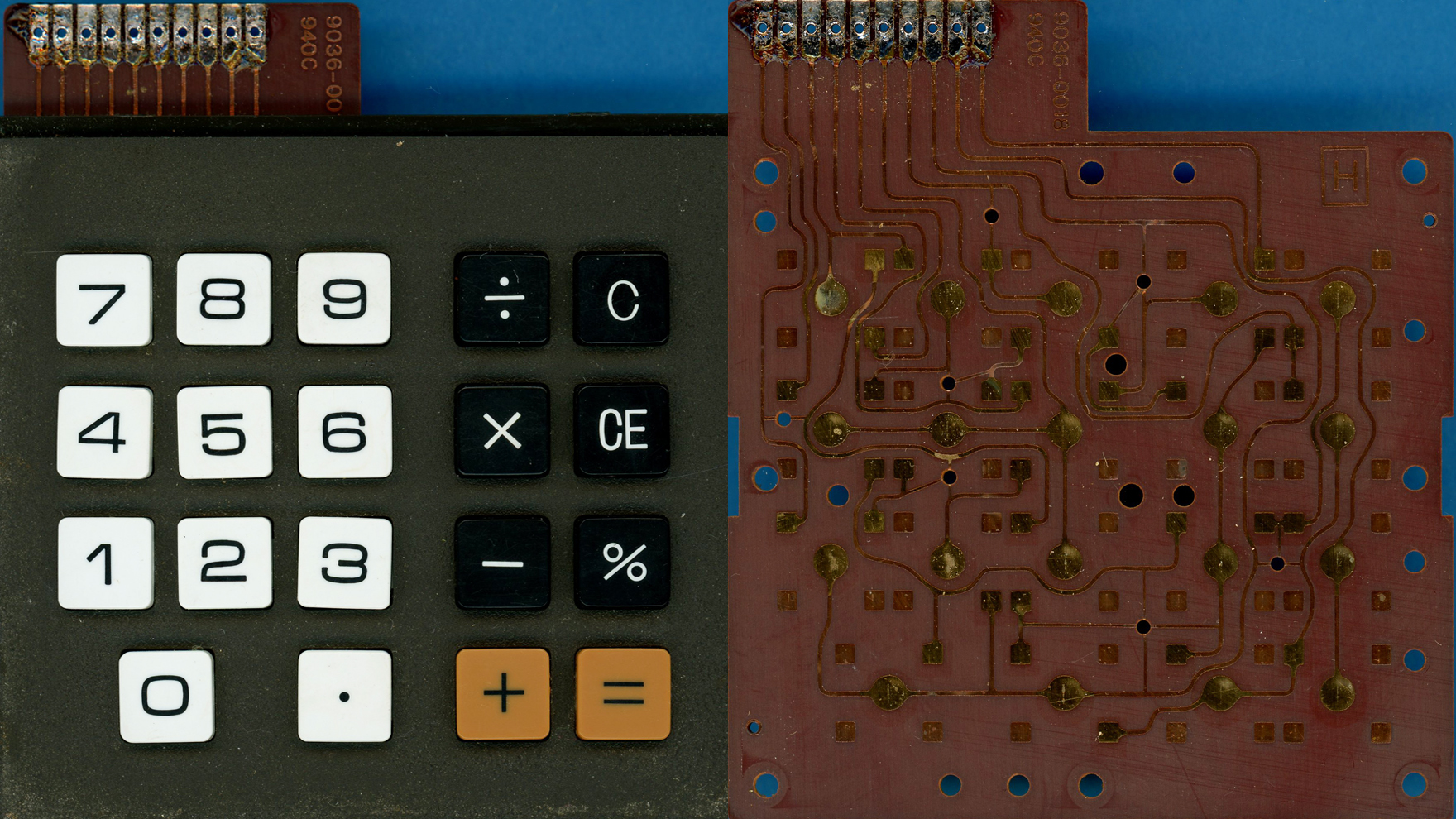 NEC) calculator manufactured in October 1975 with its (mirrored) backside.![]() |