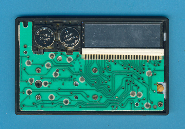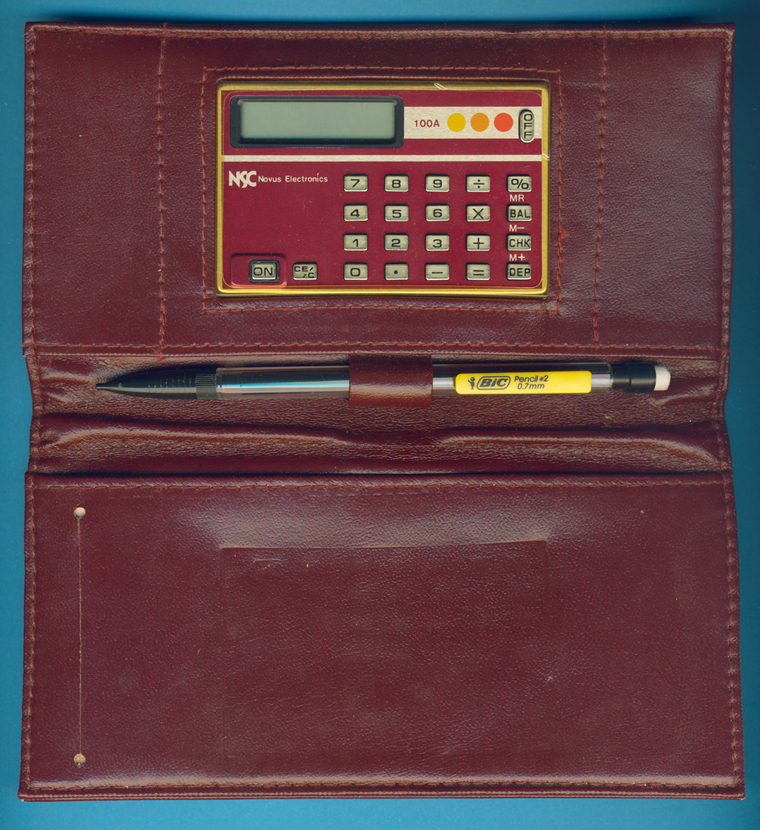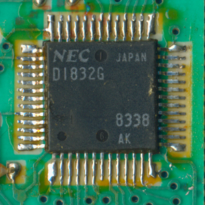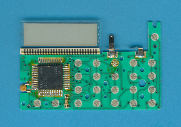 (PCB) of the NSC Novus Electronics NS100A Data Checker calculator is centered around a NEC uPD1832G single-chip calculator circuit.
