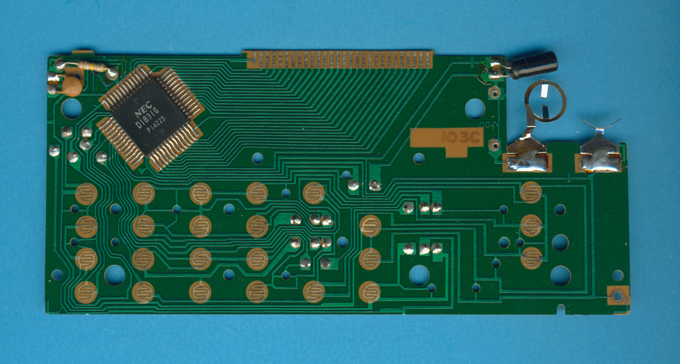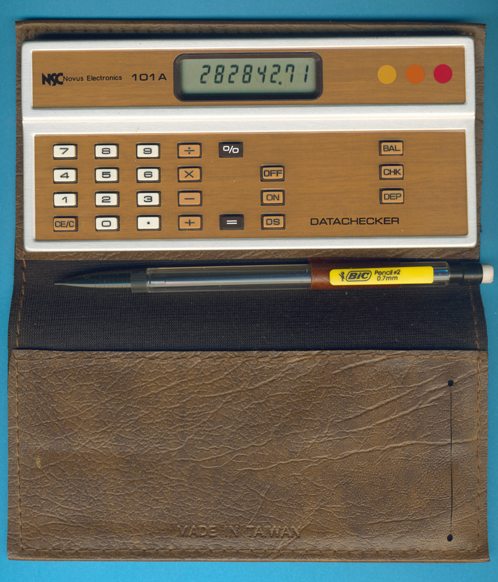 (PCB) of the NSC Novus Electronics NS101A Data Checker calculator is centered around a NEC uPD1831G single-chip calculator circuit.