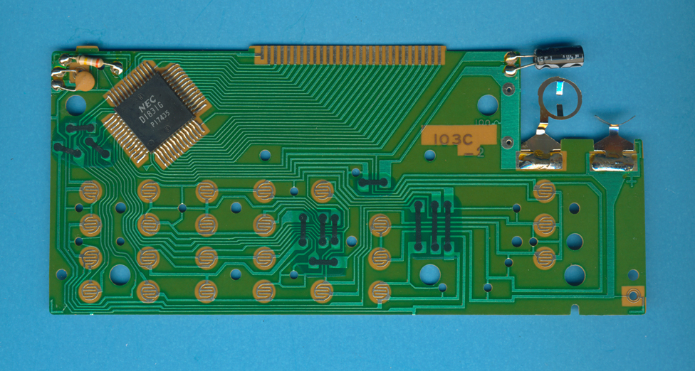 (PCB) of the NSC Novus Electronics NS101A Data Checker calculator is centered around a NEC uPD1831G single-chip calculator circuit.