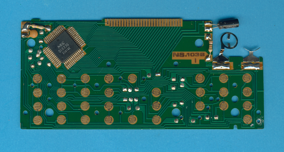 (PCB) of the National Semiconductor NS103A Data Checker calculator is centered around a NEC uPD1833G single-chip calculator circuit.
