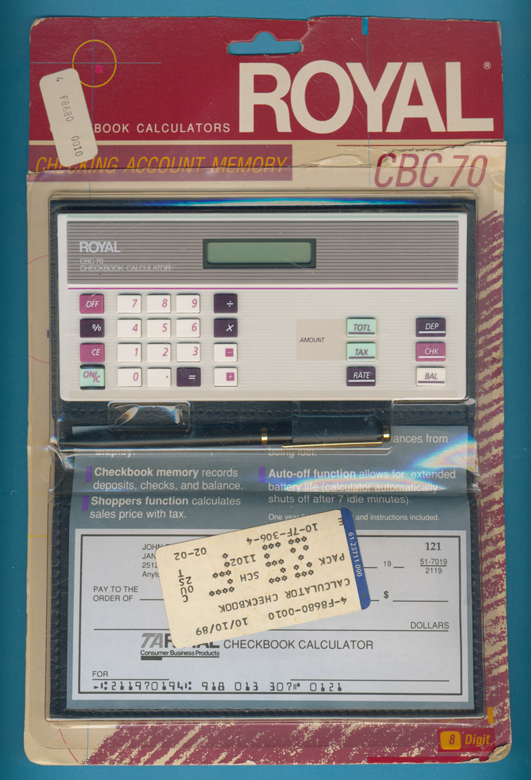 box of the Royal CBC 70 Checkbook Calculator sold around October 1989