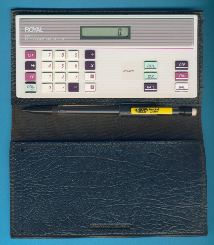 Calculator in its sleeve with holder for a checkbook and pen.![]() |