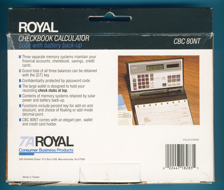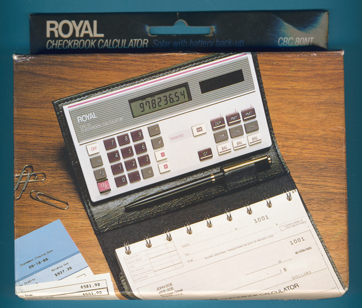 box of the Royal CBC 80NT Checkbook Calculator sold around 1987