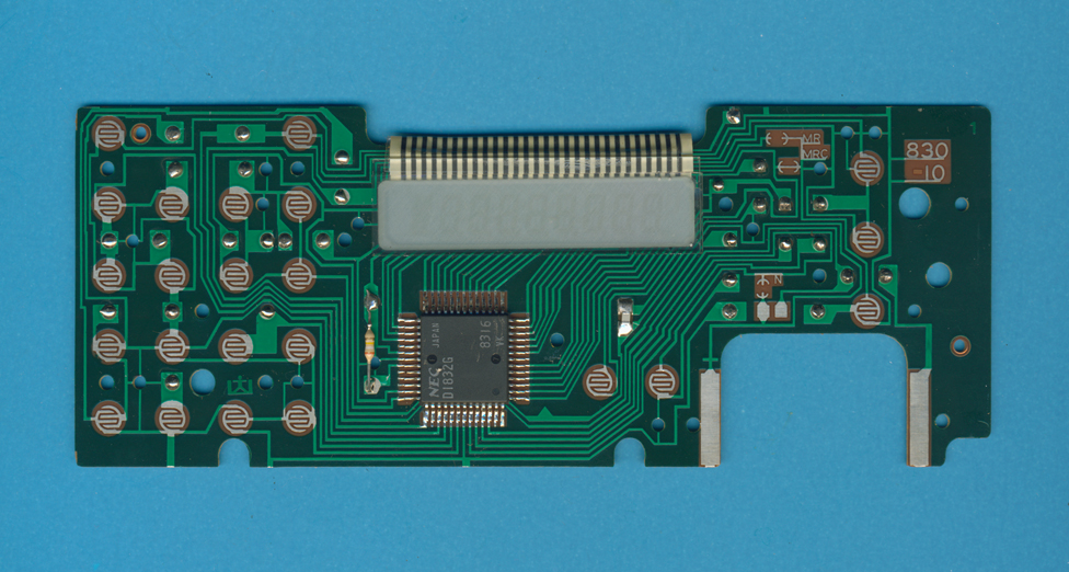 (PCB) of the Royal LCB 830 Checkbook Calculator is centered around a NEC uPD1832G single-chip calculator circuit.