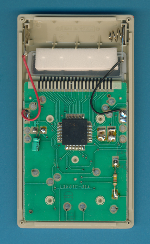 (PCB) of the Technico LC-601 is centered around an unknown single-chip calculator circuit.