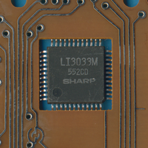 Close-up view of the Sharp LI3033M single-chip calculator circuit.