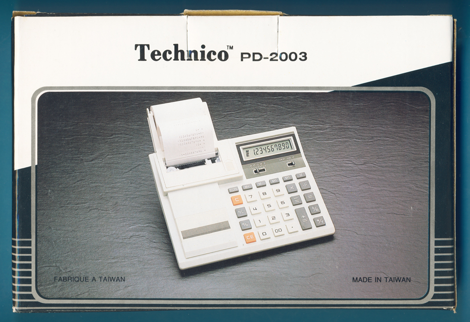 box of a Technico PD-2003 small printing desktop calculator sold in 1985 in the United States.![]() |