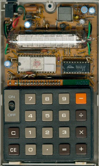 early Toshiba T3241 calculator circuit driving a green Fluorescent display. |