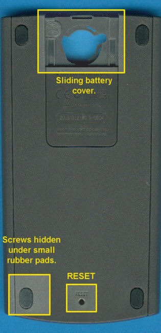 calculator sports a sliding battery cover and hides the 4 screws under rubber pads. |