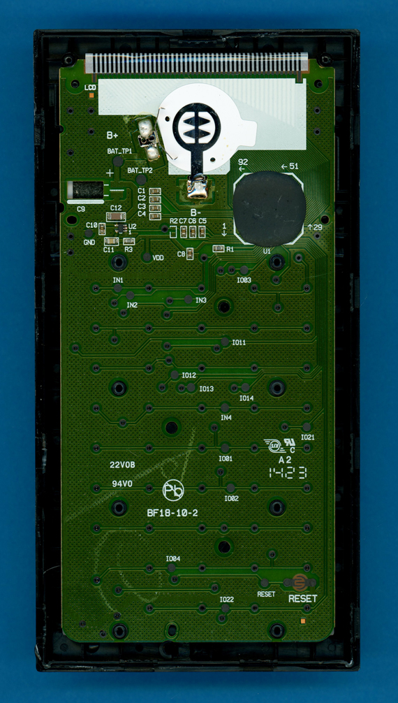 circuit board (PCB) of the BA II Plus Professional is centered around an unknown single-chip calculator circuit.