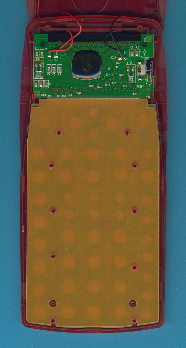circuit board (PCB) of the TI-10 is centered around an unknown single-chip calculator circuit. |