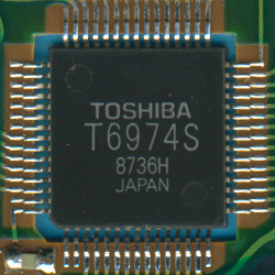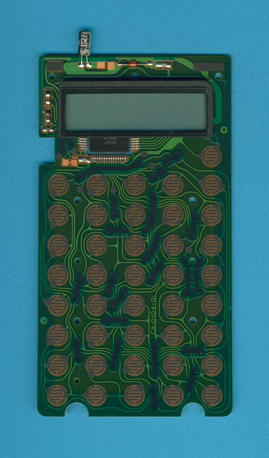 (PCB) of the TI-31 SOLAR is centered around the Toshiba T6974S single-chip calculator circuit.