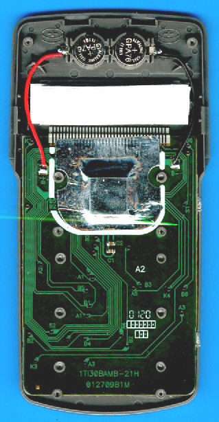 of the TI-36X Solar manufactured in China with the calculator circuit bonded directly on the PCB (COB-technology or chip-on-board). |