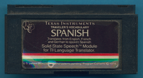 board (PCB) of the "Spoken Spanish" Solid State Speech Module with four Speech ROMs: CD 2315, CD2316, CD2317, and CD2318. ![]() |