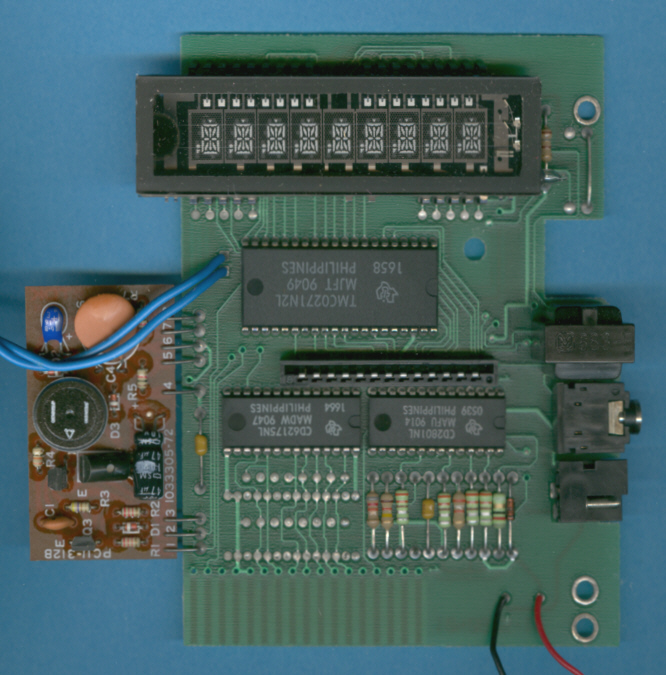 around a TMC0271 Microcontroller, a TMC0281 Voice Synthesis Processor (VSP), a TMC0350/CD62175 Voice Synthesis Memory (VSM), and a small power supply and 9 character VF-Display. Please notice the extra space for a second VSM.
