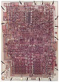 TMS1000_DICE.jpg (679163 Byte)The TMS1001 was the first LSI MOS chip of the TMS1000 family used in the Texas Instruments SR-16 calculator. The chip contains a microcomputer complete with a program ROM having 1,024 eight-bit words; a temporary storage RAM; input (from keypad); output (to control keypad scan and LED display); and an oscillator (clock). The TMS1000 chip was designed to span a range of hand-held calculator products (from four-function up through simple memory calculators). Since the chip had to be customized with the ROM program appropriate to a product, other programmable features were included to improve the chip's flexibility. This programmability was provided by two programmable logic arrays (PLAs). The output PLA converts five bits into twenty 8-bit output patterns in order to conserve program space. These patterns are specified by the calculator designer and represent different output patterns on a seven-segment display. The second PLA is for instruction decoding. The chip provides 16 microinstructions, such as "gate register Y to ALU." Twelve of these microinstructions form the fixed instruction set. The remaining instructions can be formed by combining any of the 16 microinstructions. Thus the instruction set can be specialized to improve ROM efficiency and execution speed for a particular application. Several special features of the microcomputer are aimed at the calculator application. The data paths are 4 bits wide to allow serial processing of binary-code decimal (BCD) digits. The arithmetic functions assume 2's complement integers, special instructions can be formed to facilitate BCD arithmetic (e.g., add six to accumulator for adjustment to legal BCD digits). Another BCD-oriented feature is the RAM addressing, which provides for four words of sixteen 4-bit fields. While the SR-16 only displays eight digits, the extra can he used as "guard" digits to maintain numerical precision or as expansion space for future products with larger displays or exponent displays. (Note that the BCD digit-serial data path allows for this expansion by increasing the loop count on variable-length-dependent operations.) The TMS 1000 applicability is primarily limited by ROM (program), RAM (user-accessible internals and temporaries), speed, and number of I/O pins. All the calculator functions are done by program. Two time-consuming functions are display refreshing and keypad scanning. The monolithic microcomputer must serially refresh the digits of the current display value at a sufficiently high frequency to achieve "persistency." The monolithic microcomputer must also serially examine keypad rows to see if any keys have been depressed. Even simple functions, such as Add, can take several instructions to execute, since BCD digits are addressed sequentially. Due to limitations on the LSI chip density, certain architectural features add to programming complexity: