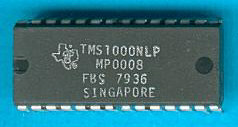 The TMS1000 is actually a series of 4-bit Microcontrollers containing ROM, RAM, I/O, & CPU on one chip produced by Texas Instruments. Find the original press release here. The units are not capable of expansion in any way. The highest clock frequency attainable by the series is 0.4MHz. This results in a 2.5 microsecond clock cycle. All instructions execute in 6 clock cycles. The devices were fabricated using PMOS and required a single -15V supply.