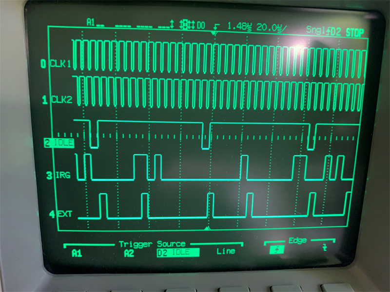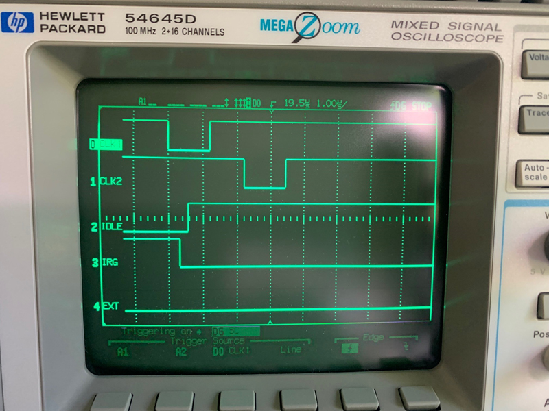 Hewlett-Packard HP-54645D Mixed Signal Oscilloscope (MSO) showing the two Clock Signals CLK1 and CLK2, Sync Signal IDLE and the two serial data signals IRG and EXT.