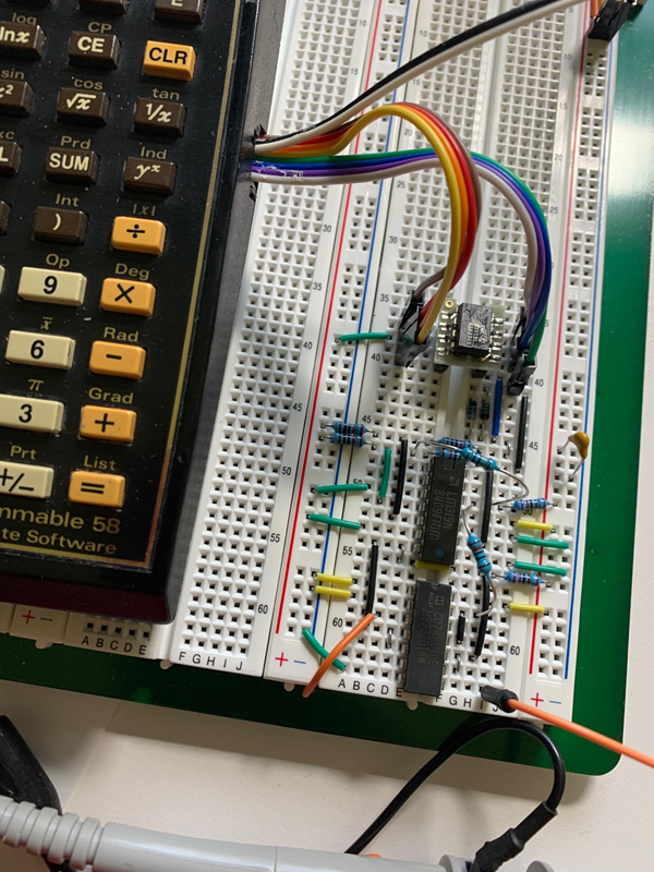 The TI Programmable 58 "Donor" calculator connected with 8 wires to the TMC0541 CROM removed from its Master Library Solid State Software Module.