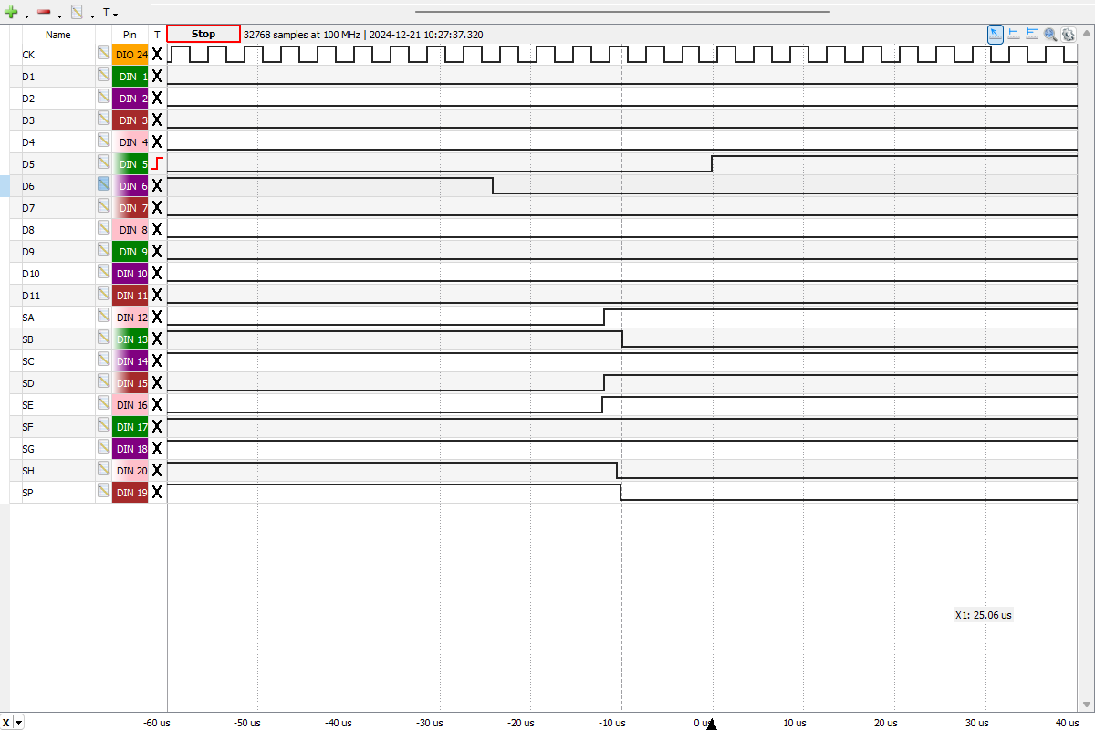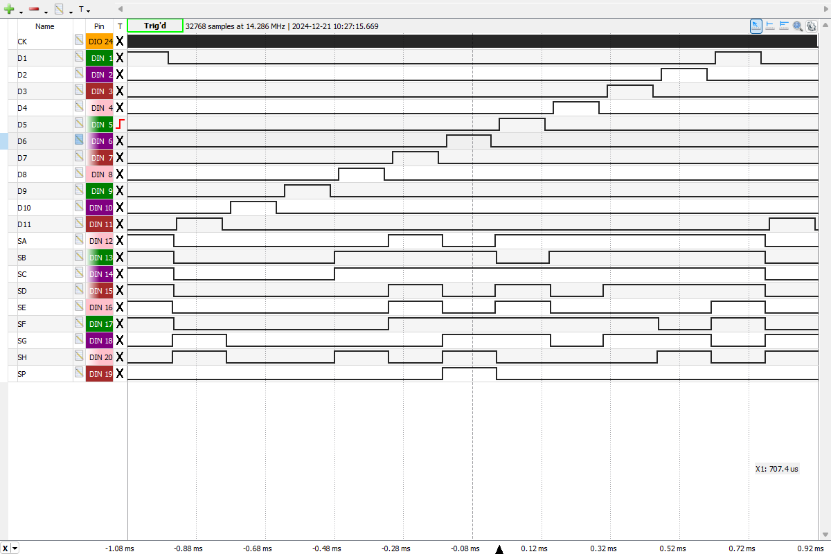 manufactured in June 1974 displaying "-104.679" and captured with the Digilent Digital Discovery connected to the DCM-50A Platform. TMC0605NC Clock Frequency set to 250 kHz. ![]() |