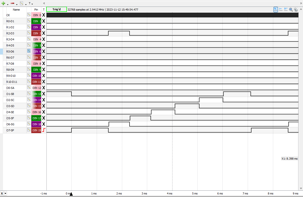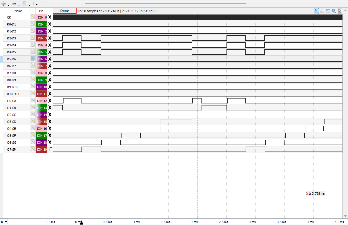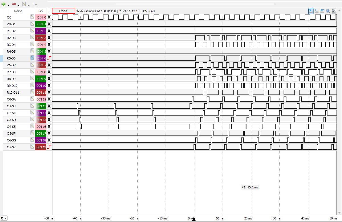 the Digilent Digital Discovery connected to the DCM-50A Platform. TMC0907NL actually alternates between two completely different Display Scanning Cycles. (Note: The CK Frequency is set to 300 kHz and not properly displayed due to a sampling rate of just 150 kHz) ![]() |