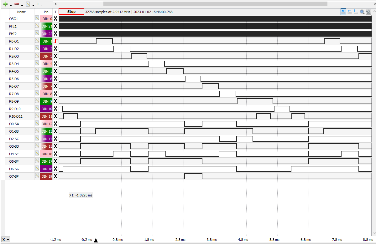 manufactured in December 1981 displaying "-1234.56789" and captured with the Digilent Digital Discovery connected to the DCM-50A Platform. TMC1073NL Clock Frequency set to 300 kHz. |