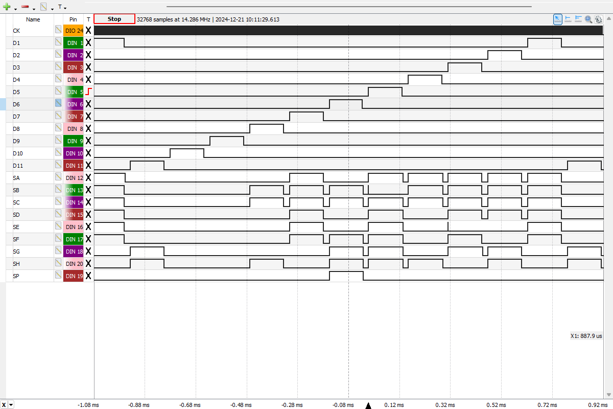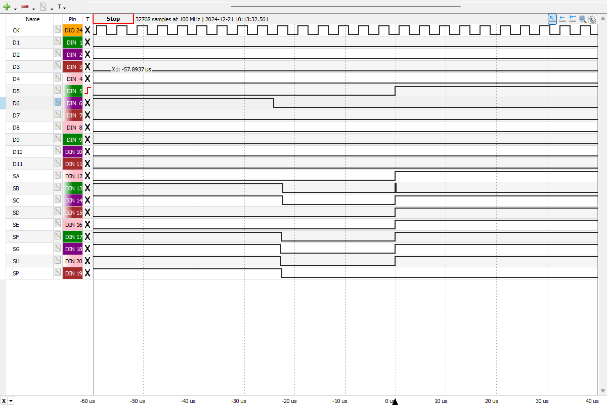 manufactured in September 1974 displaying "-104.679" and captured with the Digilent Digital Discovery connected to the DCM-50A Platform. TMS0603NC Clock Frequency set to 250 kHz. ![]() |