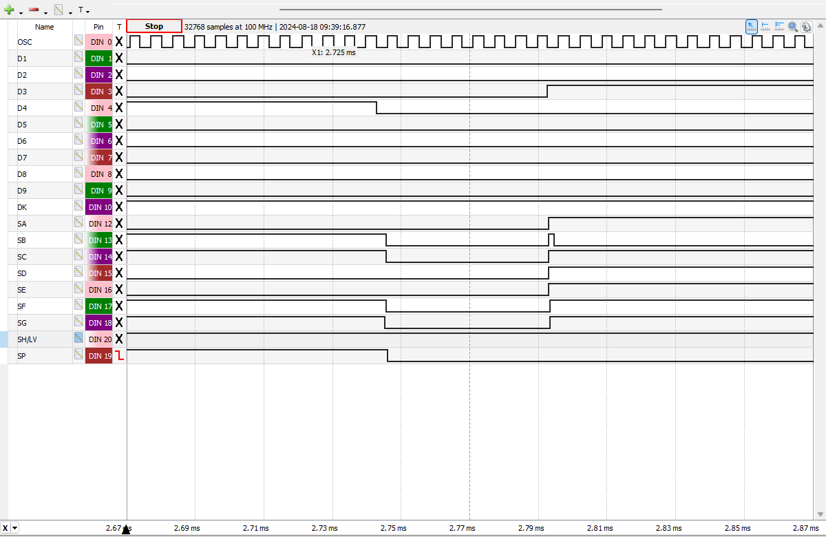 manufactured in July 1974 displaying "-104.679" and captured with the Digilent Digital Discovery connected to the DCM-50A Platform. TMS0801NC Clock Frequency set to 160 kHz. |