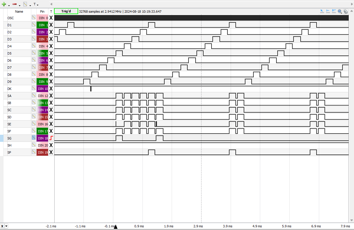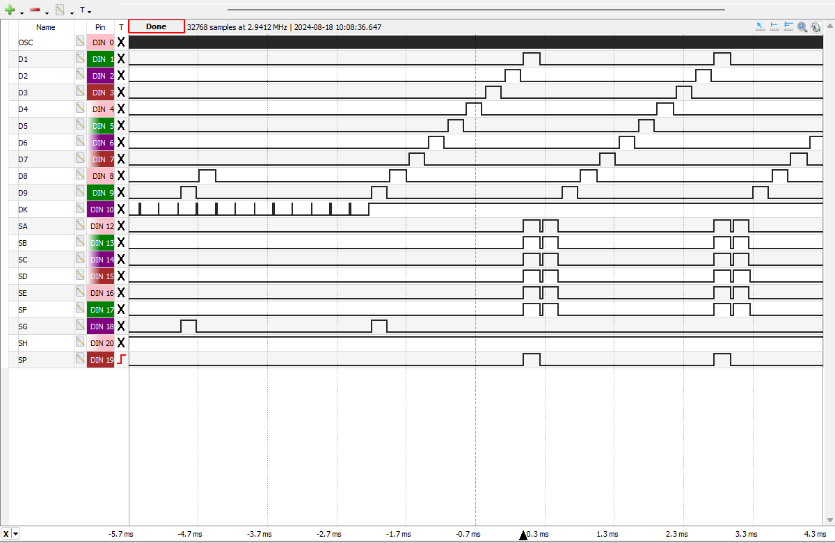 the Digilent Digital Discovery connected to the DCM-50A Platform. TMS0801NC scans only Digits D9 and D8 while outputting a '-' on the leftmost Digit. ![]() |