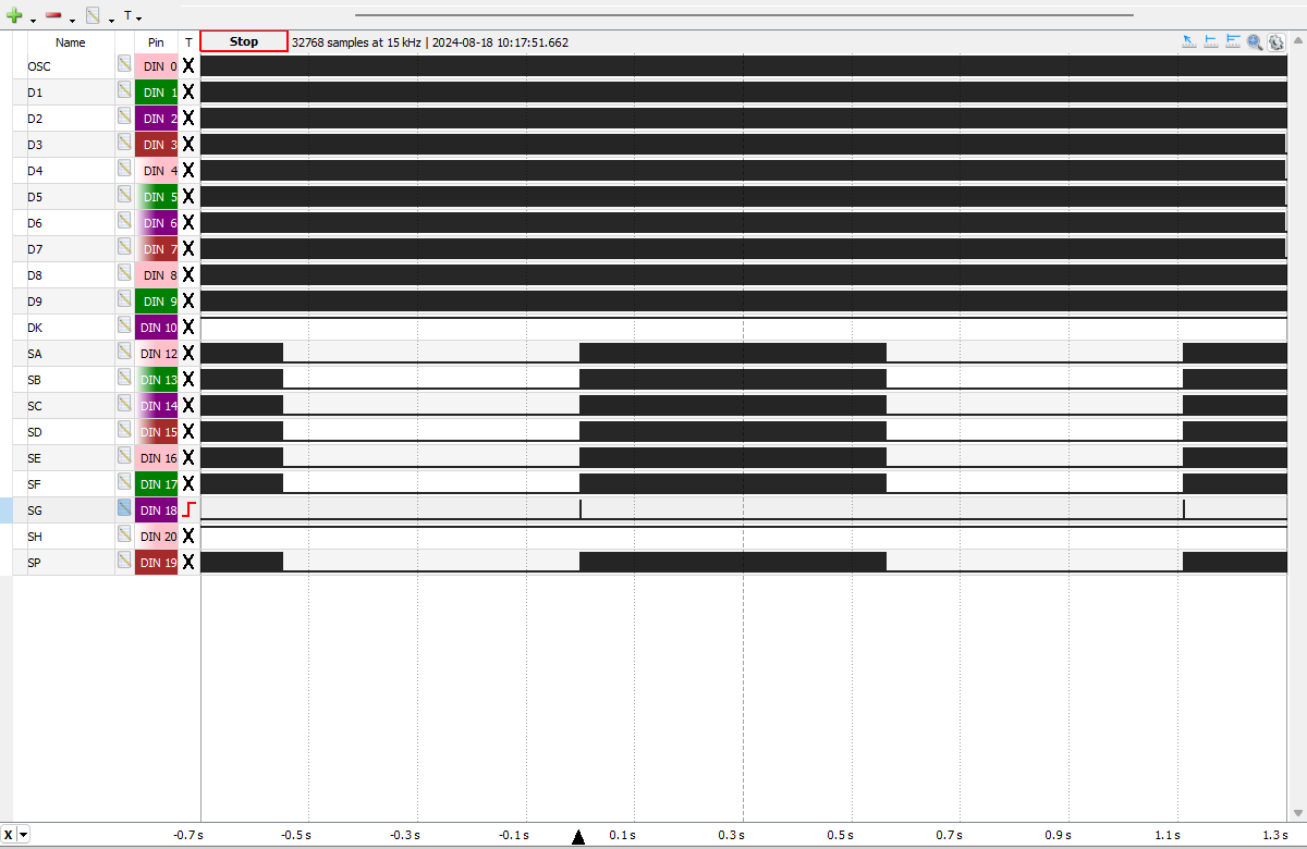 the Digilent Digital Discovery connected to the DCM-50A Platform. Please notice the short spike of Segment G. ![]() |