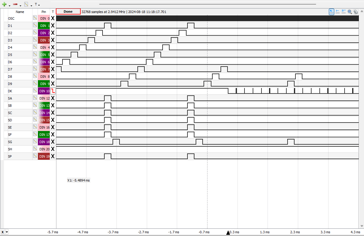the Digilent Digital Discovery connected to the DCM-50A Platform. TMS0803NC scans only Digits D9 and D8 while outputting a '-' on the leftmost Digit. ![]() |