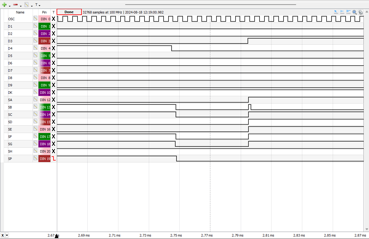 manufactured in October 1974 displaying "-104.679" and captured with the Digilent Digital Discovery connected to the DCM-50A Platform. TMS0807NC Clock Frequency set to 160 kHz. |