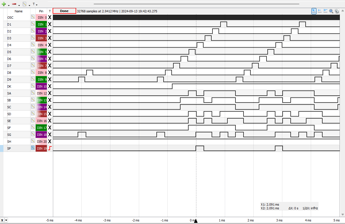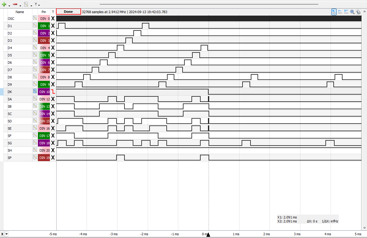 the Digilent Digital Discovery connected to the DCM-50A Platform. TMS0855NC scans only Digits D9 and D8 while outputting a '-' on the leftmost Digit. ![]() |