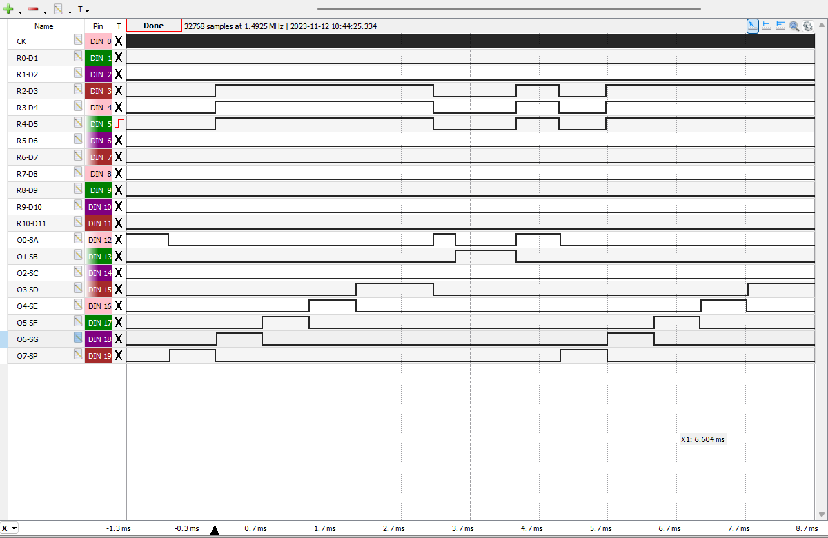 the Digilent Digital Discovery connected to the DCM50A Platform. TMS0975NL actually outputs "666" but doesn't scan Segment C. ![]() |