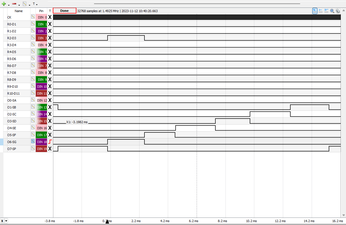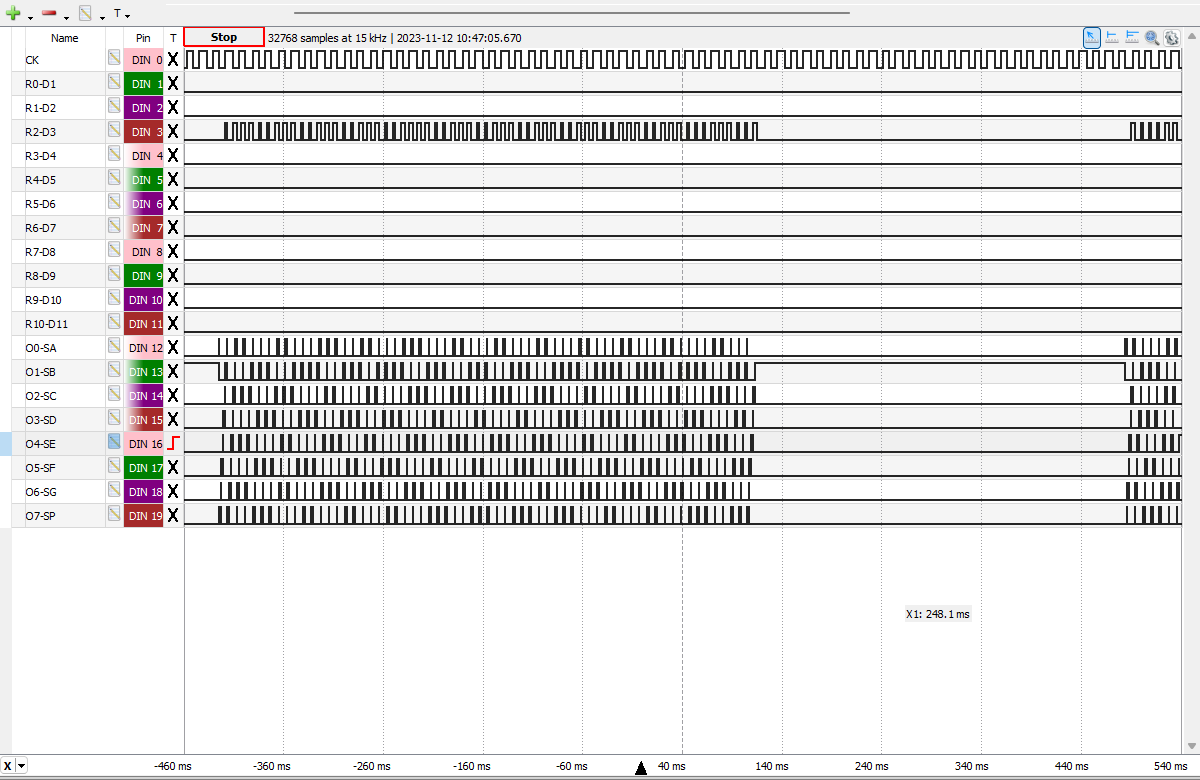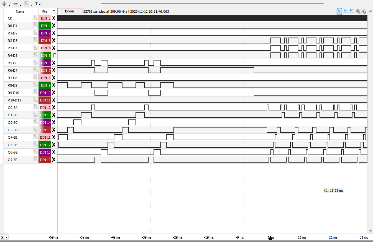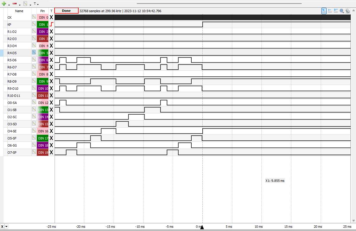 the Digilent Digital Discovery connected to the DCM-50A Platform. TMS0975NL actually pauses between the Display Scanning Cycles. (Note: The CK Frequency is set to 150 kHz and not properly displayed due to a sampling rate of just 30 kHz) ![]() |
