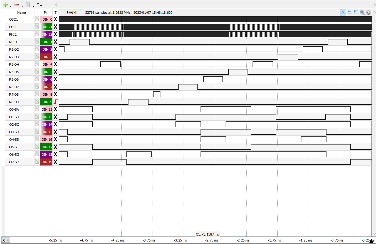 manufactured in June 1977 displaying "- 1234.567" and captured with the Digilent Digital Discovery connected to the DCM-50A Platform. TMS1045NL Clock Frequency set to 300 kHz. |